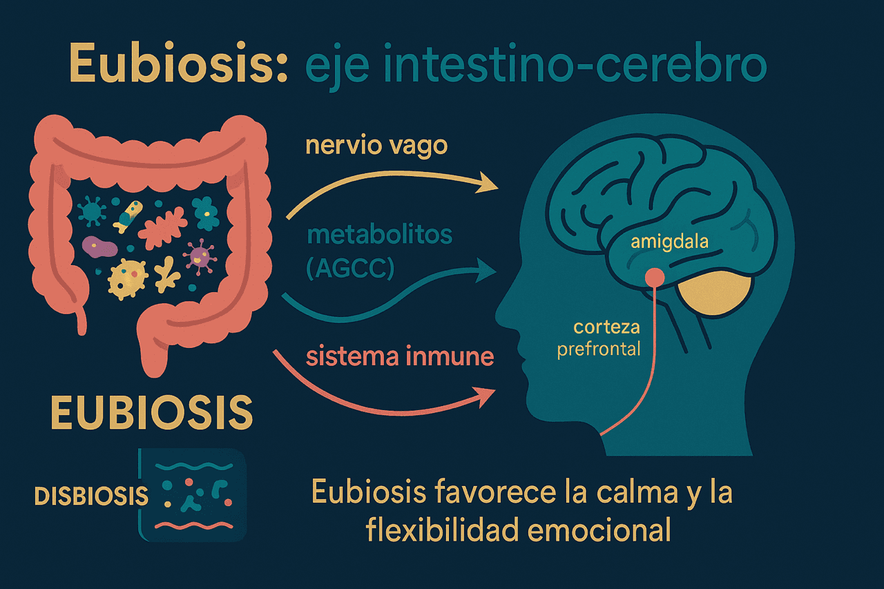 Una dieta muy rica en azúcares, harinas refinadas y ultraprocesados puede favorecer disbiosis: una alteración de la composición y función de la microbiota intestinal. Esa disbiosis puede cambiar la producción de metabolitos bacterianos, alterar la barrera intestinal, aumentar señales inflamatorias y modificar la comunicación intestino-cerebro. No es solo un problema digestivo: afecta a inmunidad, neuroinflamación, neurotransmisión y respuesta al estrés.